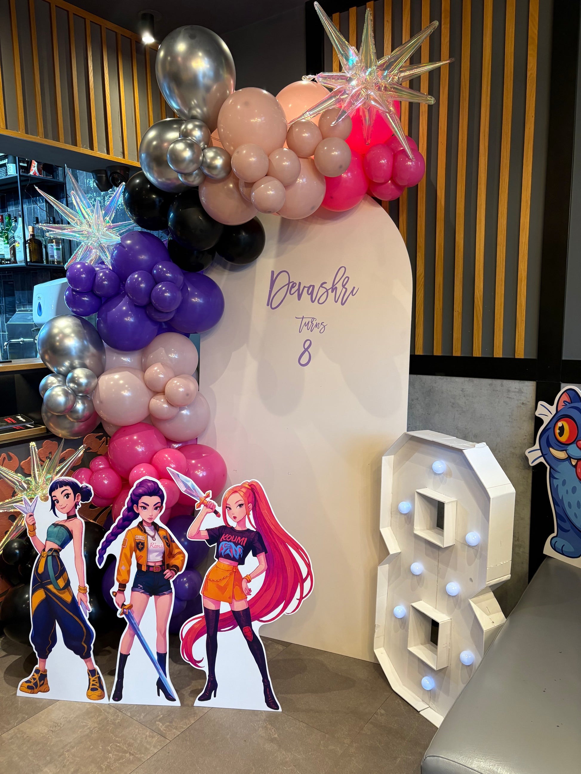 A bold K-Pop Demon Hunter themed balloon display designed to transform any birthday or celebration into a standout photo area. This setup includes a premium balloon garland in mixed colours, a themed printed backdrop, freestanding character cut-outs, and illuminated LED number lights. Perfect for children’s parties, K-Pop fans, and vibrant event styling.