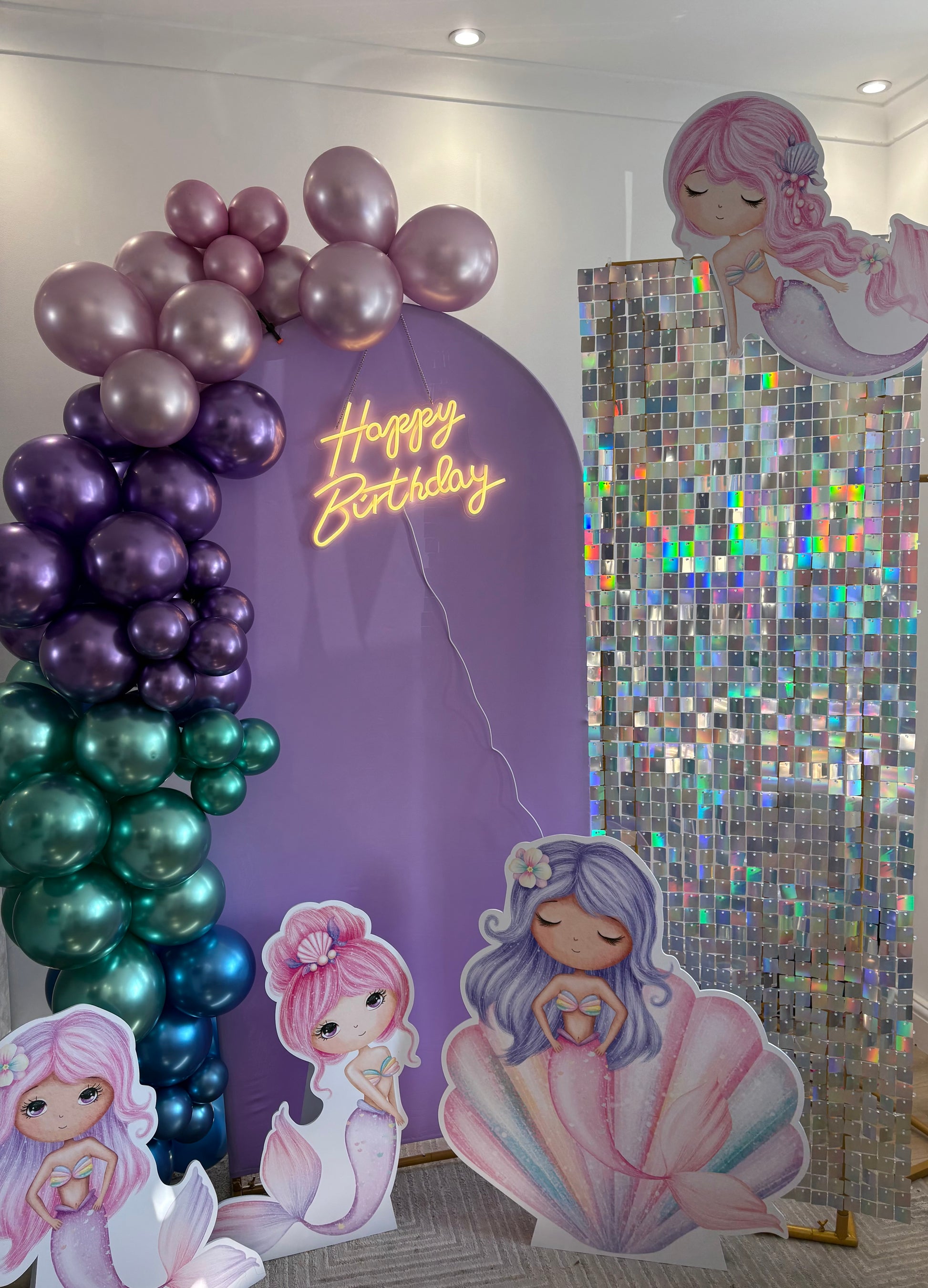 Includes sequin wall, one arch, balloon garland, birthday sign and cake plinth